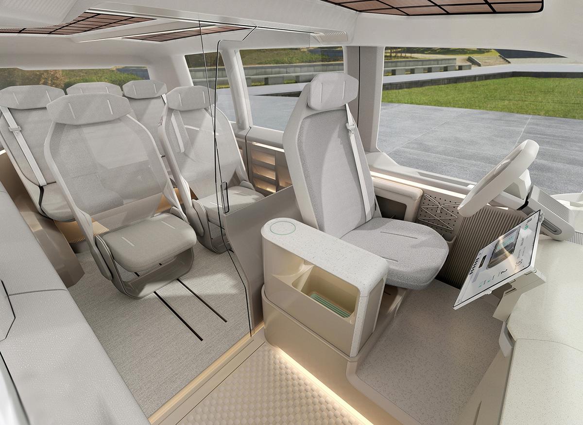 概念車采用的是1+2+3座椅布局,地板純平,帶有座椅調節滑軌,座椅也是家具化的風格,整體用料和和配色視覺效果很清新輕松。