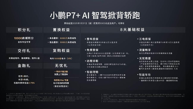 至2025年1月31日24點前支付5000元定金用戶,除8大基礎權益外,全系車型還可享10000小鵬商城積分、至高5000元的置換補貼、贈送每年1500度充電卡(6年)的復購權益、低至0首付長至5年期的限時優惠金融方案,以及免費贈送天幕遮陽簾、簇絨腳墊、隨車U盤的交付禮等購車福利。用戶可通過小鵬汽車官方APP、官網、微信小程序以及全國銷售網點進行車輛訂購。