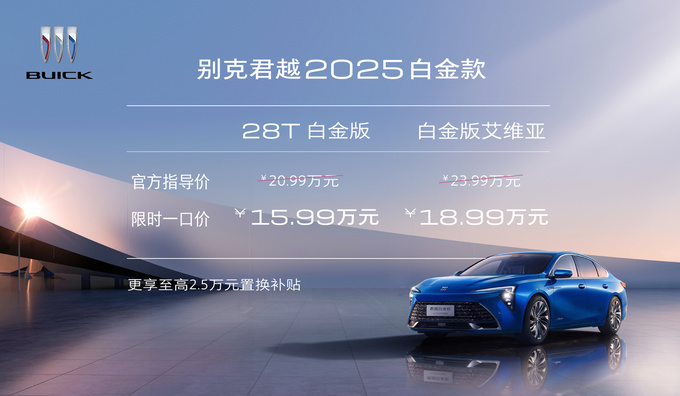 國人的老朋友,別克君越又上新了!價格再創新低!2024年10月30日,上汽通用汽車別克品牌在上海舉行了新豪華智享座駕——別克君越2025白金款上市發布會,整個發布會時間雖不長,但全程都是干貨!驚爆的價格給了大家非常大的驚喜!別克君越2025白金款 28T白金版限時一口價:15.99萬元,白金版艾維亞,限時一口價18.99萬元(國家以舊換新置換補貼15,000元+品牌置換補貼至高10,000元)!配置拉滿,價格一步到位!