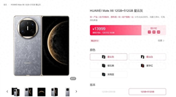 12月6日消息,今天,華為折疊屏手機Mate X6正式開售,售價12999元起。