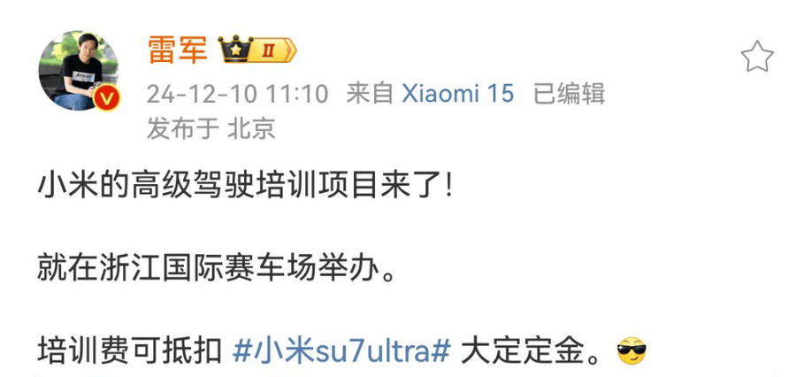 其實,早在10月29日的小米SU7 Ultra發布會上,雷軍就曾提及將推出小米駕校,為小米汽車車主提供專業培訓,這一消息在當時就引起了市場的廣泛關注。不過,隨后小米集團公關部總經理王化在11月5日發文澄清,表示雷軍提及的是未來考慮對小米汽車車主開放的三類課程,包括高級駕駛培訓、賽道駕駛培訓和漂移培訓,但當時并未確定具體的培訓費用。