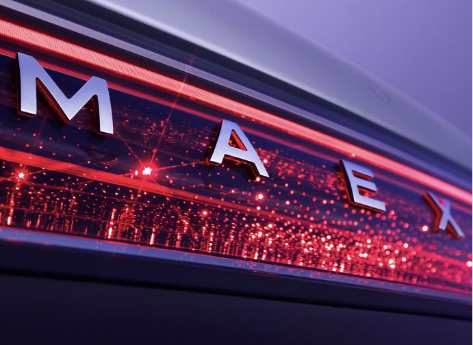 車尾部分簡潔大氣。采用貫穿式尾燈,內部加入大量點狀式光源,呈現出星光效果。尾燈中央帶有“MAEXTRO”英文標識。后包圍處配有反光條。