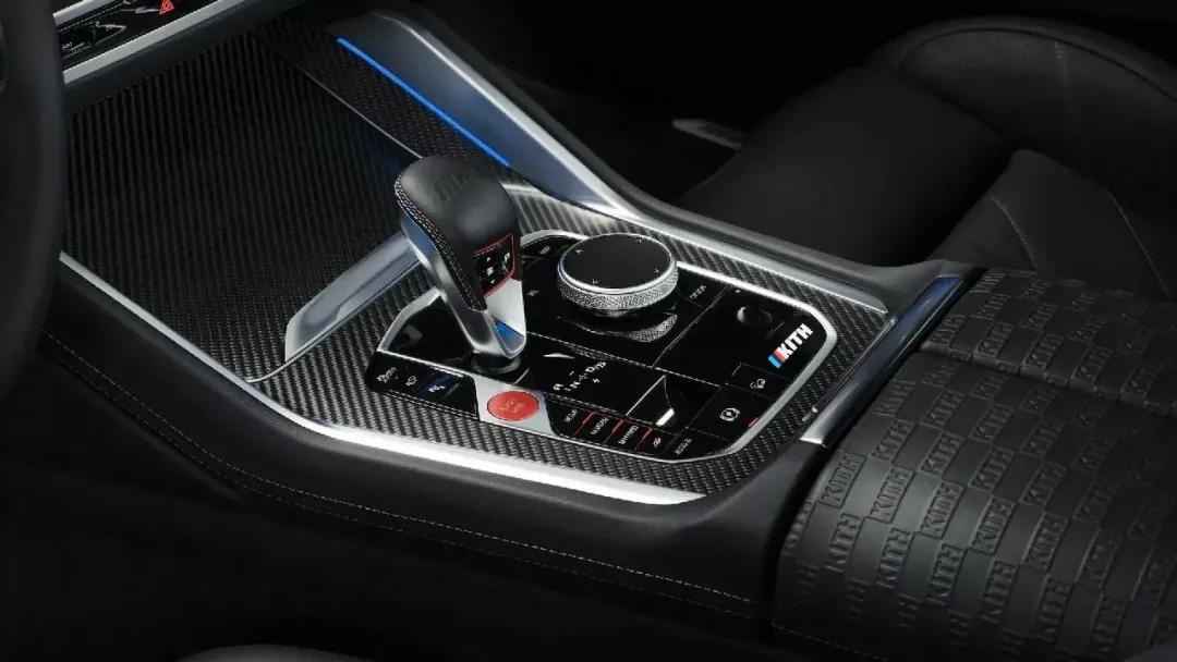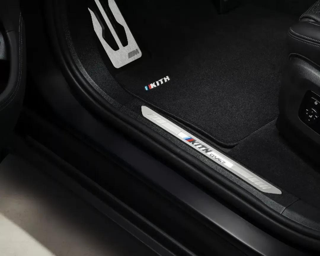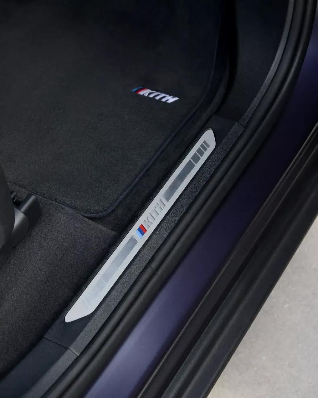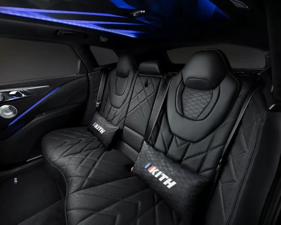 得益于帶KITH字母浮雕圖案的寶馬個性化美利奴真皮座椅,內飾得到了微妙地改造,并且還有天鵝絨腳墊,KITH標志和帶有“1/47”徽章的發光門檻條,亮點包括兩個后座靠墊,紫色內飾照明和一個特殊的KITH旅行袋。