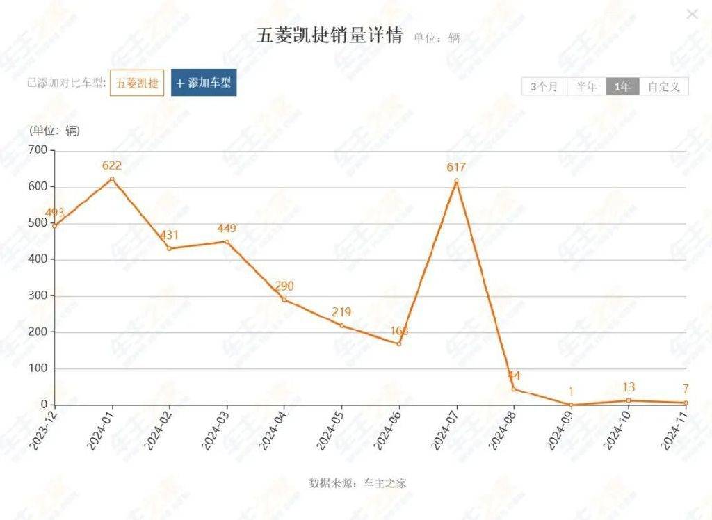 五菱凱捷,作為上汽通用五菱品牌下的首款銀標車型,于2020年11月正式亮相市場。該車在上市的第二個月即2020年12月便實現了單月銷量破萬的佳績,并延續這一勢頭至2021年初,連續兩月保持了超過1萬輛的銷售量。然而,從2021年2月份起,其銷售業績卻遭遇波動,呈現出不穩定的趨勢。直至2024年11月期間,這款車未能再現往日輝煌,不僅月銷量再未觸及過萬門檻,甚至近一年來單月銷量均未達到三位數水平,最終降至僅7輛的地步。這樣的市場表現對于五菱凱捷而言無疑是一個挑戰。