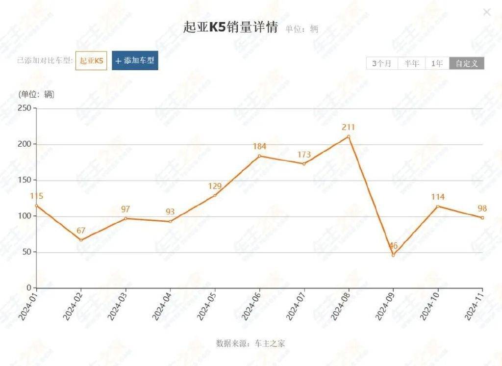 自2020年9月上市至今,起亞K5經歷了四年多的市場洗禮。盡管在初期曾有短暫的銷量上升,但隨后其銷售業績便持續走低,多數月份的銷量僅維持在三位數。進入2024年后,情況更為嚴峻,單月銷量突破200輛似乎已成為遙不可及的目標,即便是大幅度降價促銷也難以刺激消費欲望。截至11月底,今年累計銷量僅為1326臺,其中11月單月僅售出98臺。值得注意的是,在同一細分市場內,其他合資品牌如帕薩特、邁騰、凱美瑞以及雅閣等車型表現強勁,在剛剛過去的11月份中,這些競爭對手均實現了超過一萬臺的銷售量,尤其是帕薩特更是突破了兩萬臺大關。