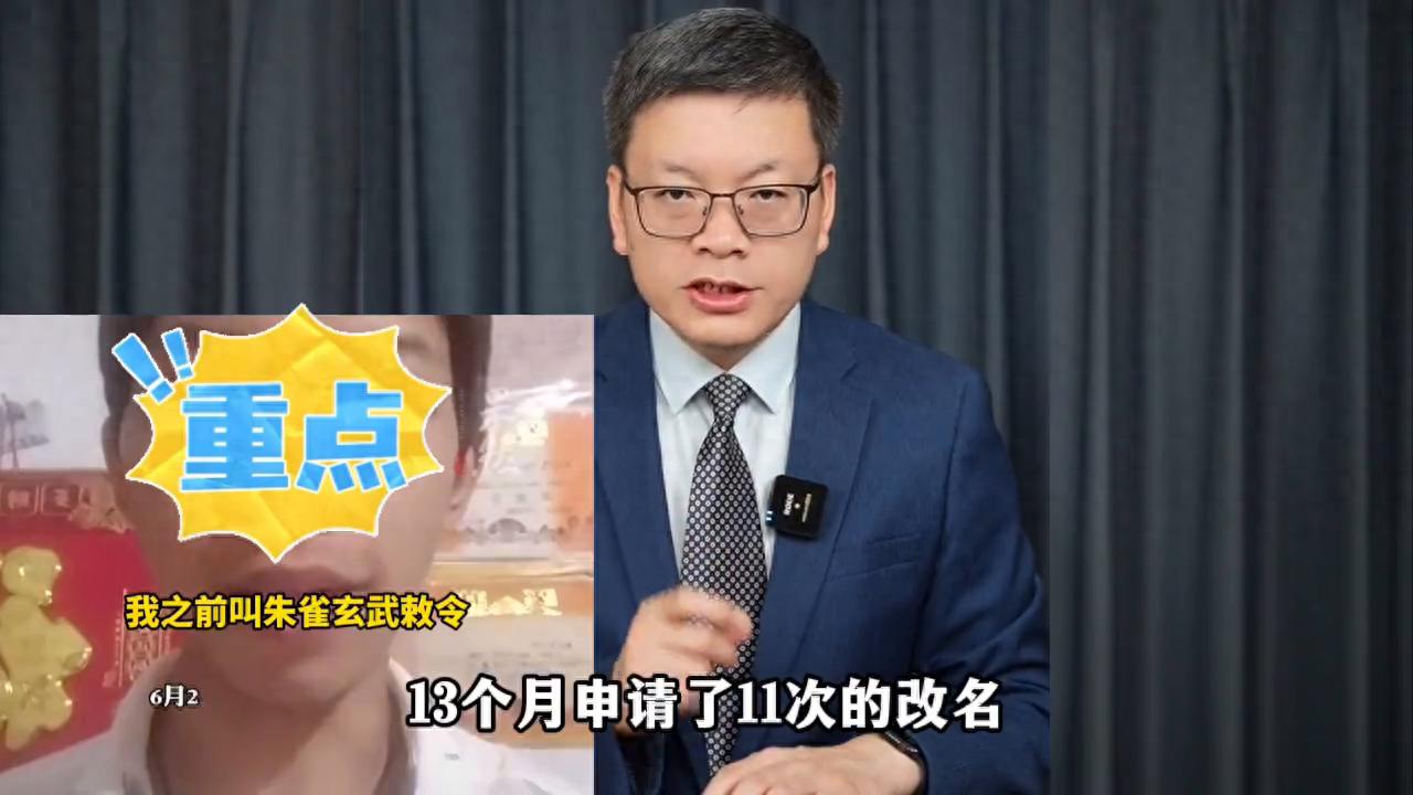 ·第一,民法點規定是公民可以依法決定使用和允許他人使用自己姓名的權利。但是后面還有一句不能有備公序良俗。而這個人改名朱雀玄武,又改名朱雀玄武赤令,完了之后又改四十八個字的什么,到最后末尾什么上帝,什么大帝,完了之后又什么喬治華盛頓等等改了十一次。