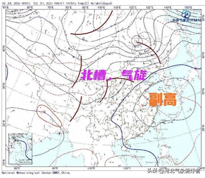 今天,隨著副高的強勢西伸,592線也已經到達山東河南境內,這表明副高很強勢,也很穩定,而此時在內蒙到四川這一帶有一個大槽正在東移,然而被副高死死頂住,只能沿588線由西南向東北延伸。