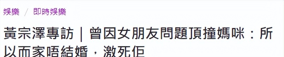 記者最近看到黃宗澤在采訪里說自己不愿意結婚,就是想氣媽媽。他說因為小時候談過女朋友,結果他媽媽一直反對,天天罵人,最后把女朋友逼走了。現在他44歲還不結婚,就是想讓媽媽難受。