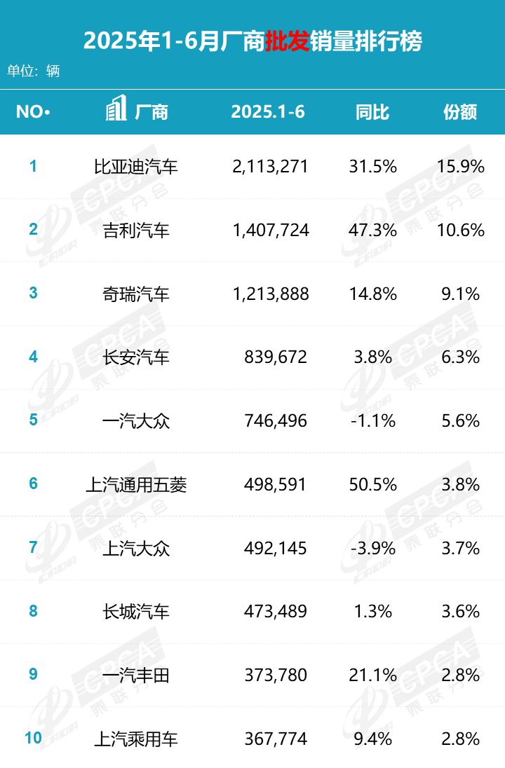 數據顯示,今年上半年,比亞迪批發量達211.3萬輛,吉利汽車批發量達140.7萬輛,奇瑞汽車批發量達121.3萬輛,分別位居榜單前三,也是唯三銷量突破百萬輛的車企。