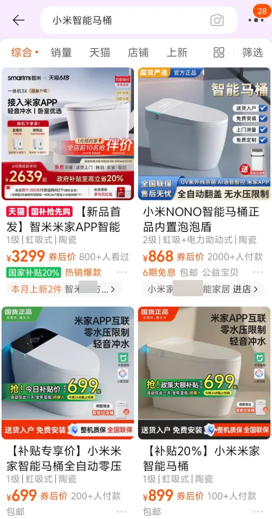 然后我就自己跑去網(wǎng)購平臺(tái),指名道姓搜索“小米智能馬桶”出來的結(jié)果。