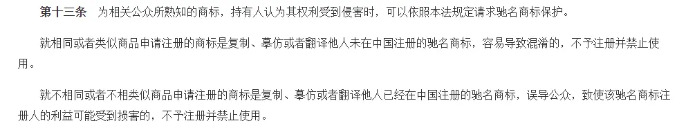 “就相同或者類似商品申請(qǐng)注冊(cè)的商標(biāo)是復(fù)制、摹仿或者翻譯他人未在中國注冊(cè)的馳名商標(biāo),容易導(dǎo)致混淆的,不予注冊(cè)并禁止使用。就不相同或者不相類似商品申請(qǐng)注冊(cè)的商標(biāo)是復(fù)制、摹仿或者翻澤他人已經(jīng)在中國注冊(cè)的馳名商標(biāo),誤導(dǎo)公眾,致使該馳名商標(biāo)注冊(cè)人的利益可能受到損害的,不予注冊(cè)并禁止使用。”
