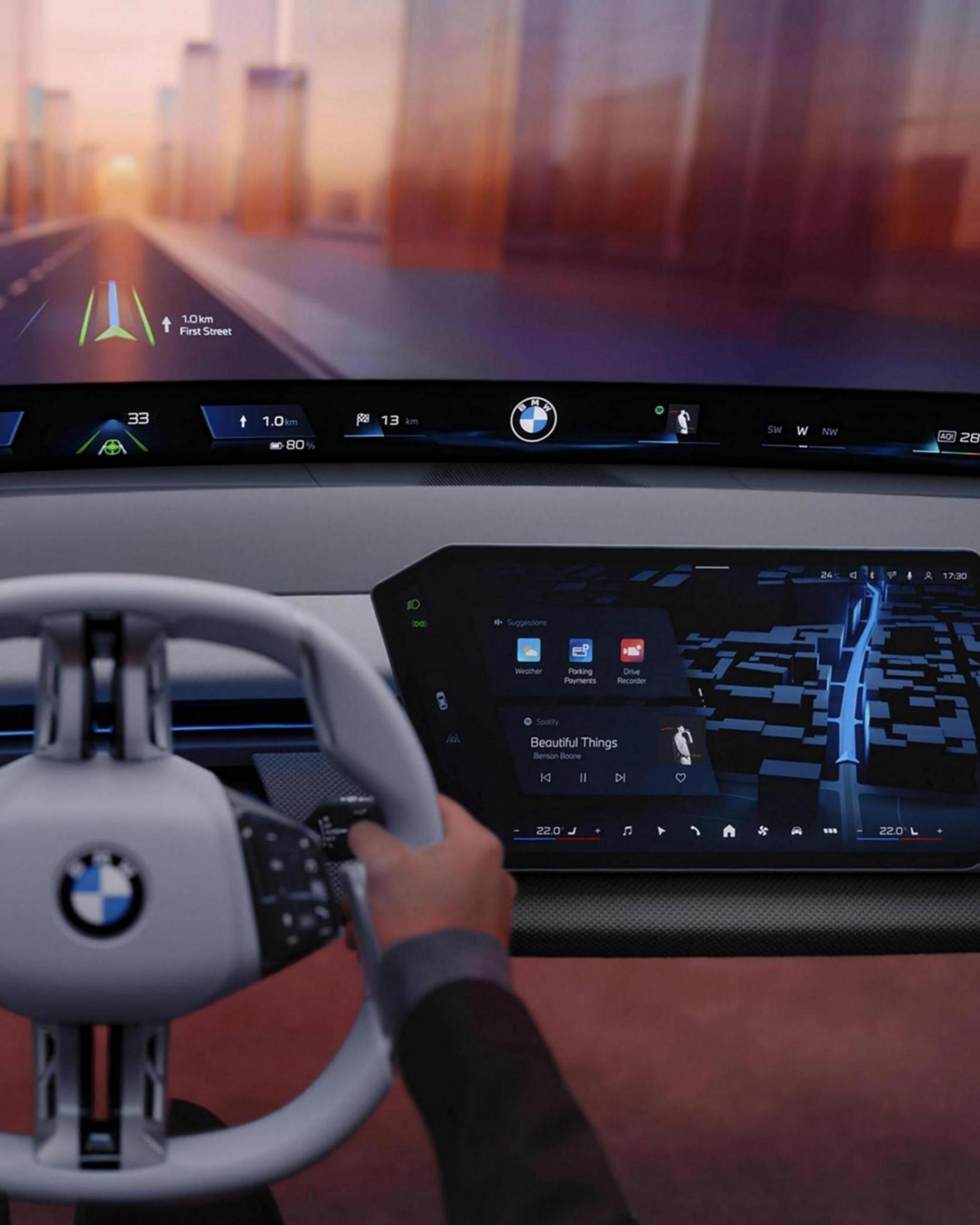 內飾還沒有公布,但肯定也是采用Neue Klasse的設計理念,如果你現在萬分羨慕小米YU7車主的「天際屏」,那你有福啦!全新一代3系很大概率會用上視平線全景顯示,內置全景iDRIVE人機交互。