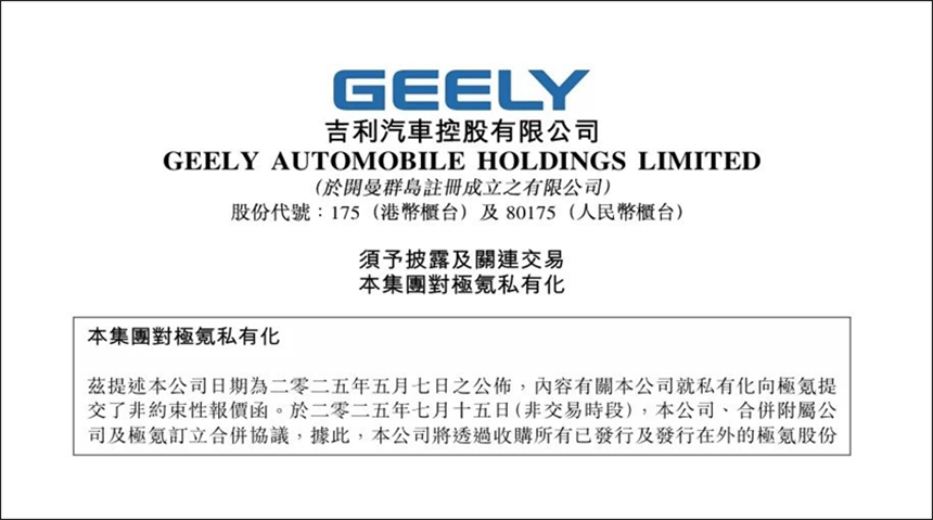 就在7月15日,吉利控股集團宣布,旗下吉利汽車控股有限公司與極氪智能科技有限公司正式簽署合并協議,吉利汽車將收購其尚未持有的全部極氪股份,極氪股東可選擇以現金或置換吉利汽車股份作為對價。