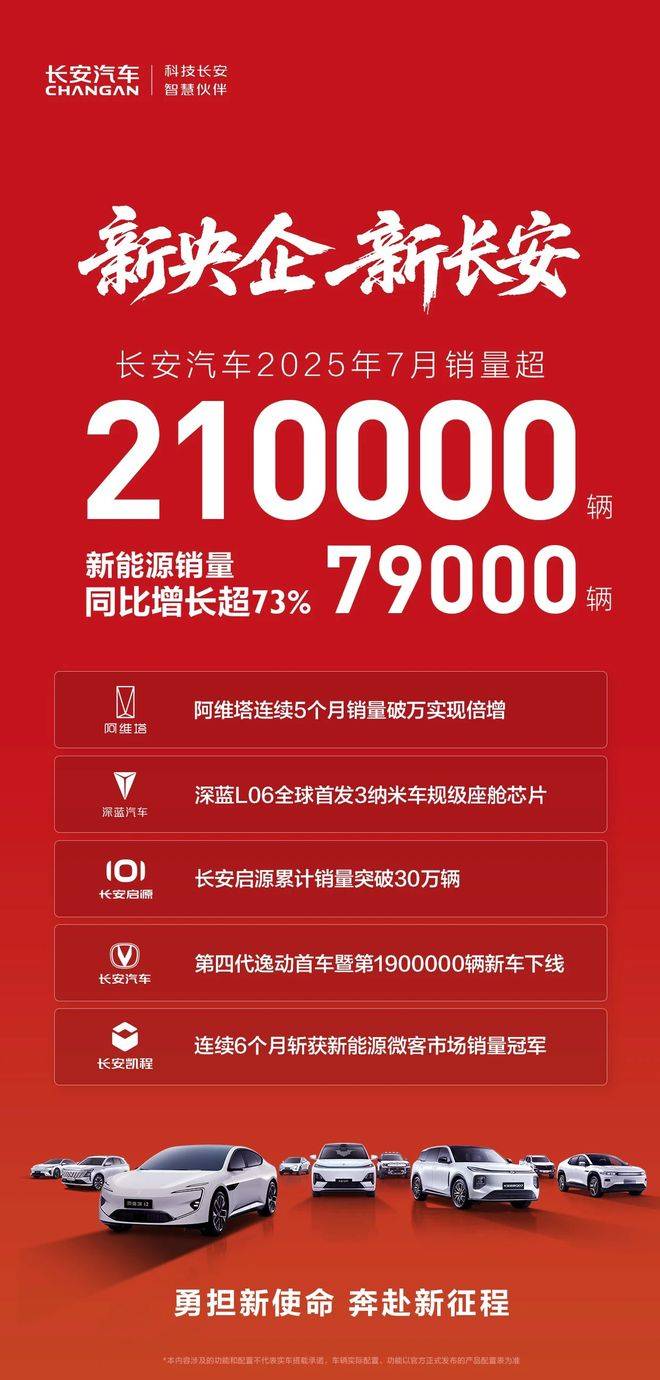 于7月27日成立的第三家汽車央企長安汽車在下半年迎來開門紅。公司7月產量達19.59萬輛,同比增長34.84%,銷量達21.06萬輛,同比增長23.43%。自主品牌在7月銷量達17.77萬輛,同比增長27.69%;新能源汽車7月銷量超過7.9萬輛,同比增幅高達73%。與此同時,長安汽車旗下品牌已連續5個月實現銷量破萬,長安啟源累計銷量也已經突破30萬輛,長安凱程已連續6個月斬獲新能源微客市場銷冠。