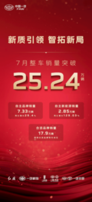 具體來看,中國一汽7月整車銷量超過25.24萬輛,同比增長6.5%;生產整車達25.36萬輛,同比增長11.4%。其中,一汽自主品牌整體銷量超過7.33萬輛,增幅達29.4%,紅旗品牌單月銷量突破3.73萬輛,同比增長21.1%;自主新能源銷量達2.85萬輛,同比漲幅高達129.03%。一汽合資品牌則持續領跑合資陣營,一汽-大眾7月銷量達到11.3萬輛,大眾品牌整車銷量同比增長2.8%;一汽豐田7月銷量超6.8萬輛,同比增長3%。