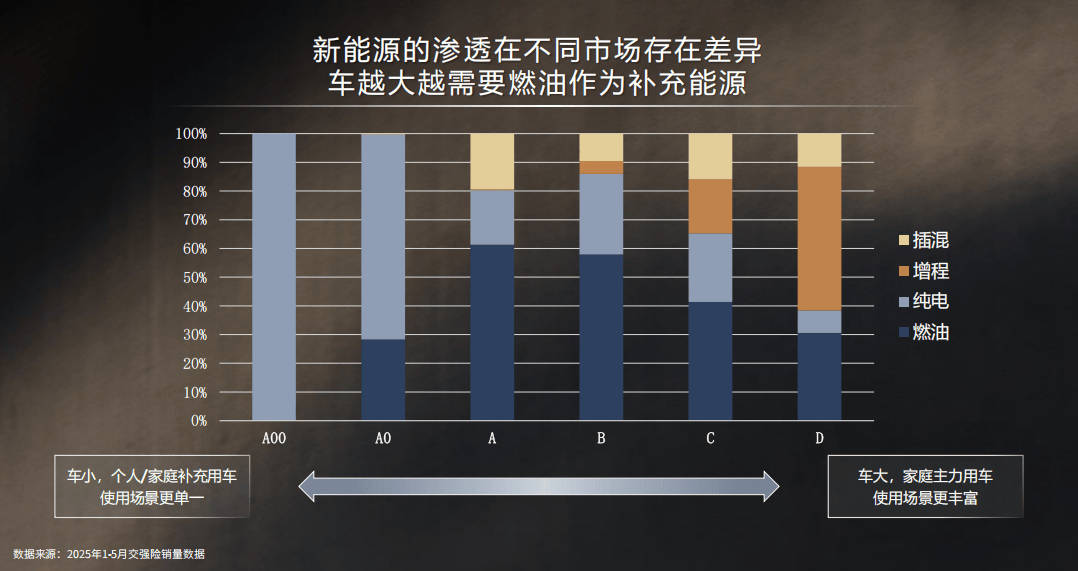 根據(jù)2025年1-5月交強(qiáng)險(xiǎn)銷(xiāo)量數(shù)據(jù)統(tǒng)計(jì)來(lái)看,純電在A00級(jí)和A0級(jí)品類車(chē)型中占據(jù)了銷(xiāo)量的主導(dǎo)權(quán),但在ABC中呈現(xiàn)不同程度的下滑,特別是在高端車(chē)型D級(jí)中占據(jù)的市場(chǎng)份額不足10%。