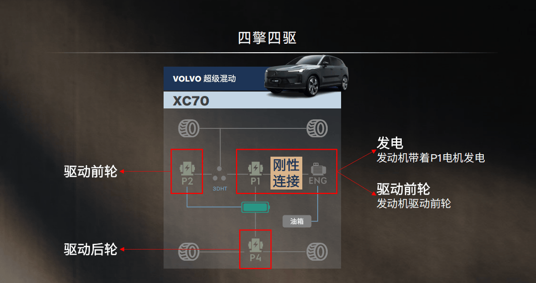 首次搭載該平臺(tái)的沃爾沃全新XC70采用P1+P2+P4技術(shù)路線,P1電機(jī)、P2電機(jī)以及變速箱采用同軸布局,低速用電、中速混動(dòng)、高速直驅(qū),全程無(wú)感切換。