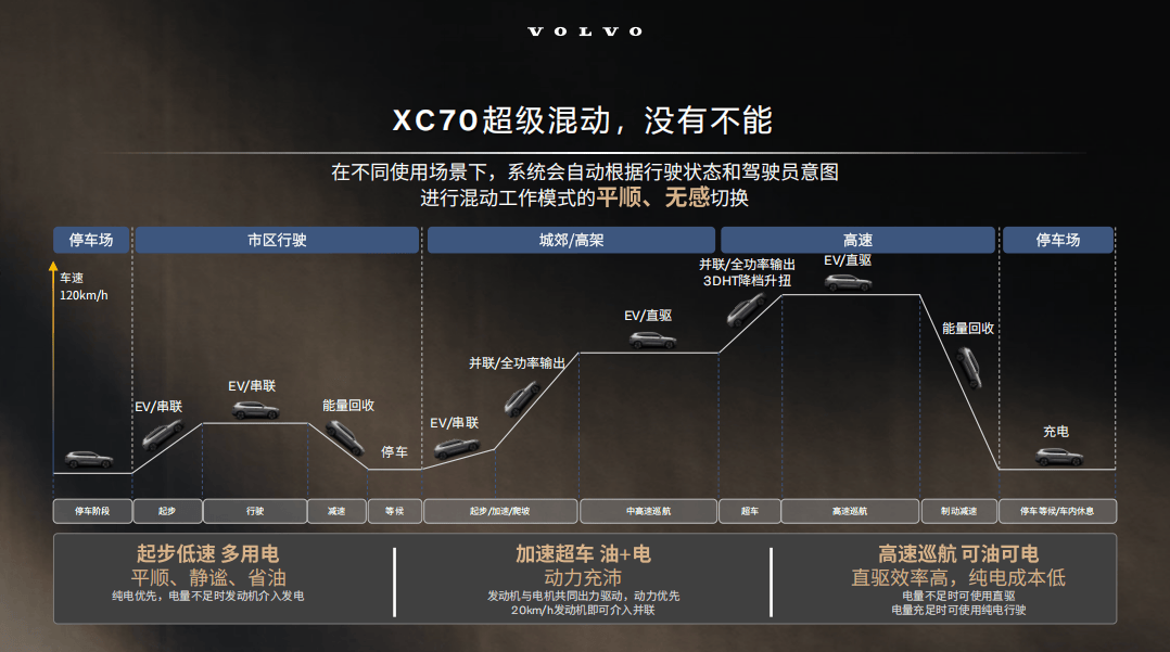 為了充分發(fā)揮多電機(jī)架構(gòu)的性能,XC70搭載了七模混動(dòng)策略,涵蓋純電、串聯(lián)、并聯(lián)、全功率輸出、直驅(qū)、怠速補(bǔ)能和能量回收等模式。這些模式并非固定不變,而是會(huì)依據(jù)駕駛狀態(tài)、電池電量、路況與負(fù)載等因素進(jìn)行動(dòng)態(tài)切換。