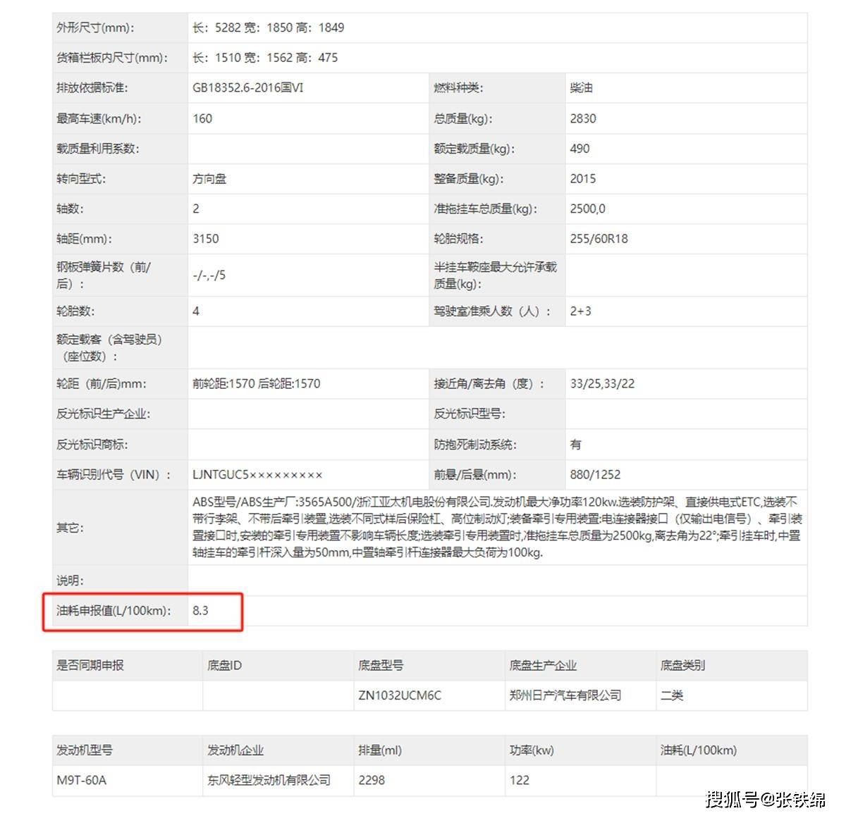 動力配置方面,新款車型搭載的是型號為M9T-60A的2.3T柴油發動機,最大功率122千瓦,其申報的百公里綜合油耗值為8.3L,最高車速160公里/小時,另外新款車型還會有2.5噸拖掛資質的版本。