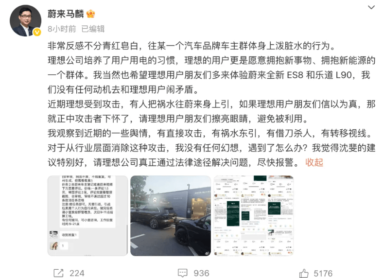 針對這一事件,蔚來汽車高管迅速作出回應。8月7日,蔚來助理副總裁,品牌、傳播與營銷負責人馬麟在微博上鄭重發聲,強烈反對向某一個汽車品牌車主群體 “潑臟水” 的行為。他言辭懇切地稱贊理想用戶是“擁抱新能源的群體”。他還指出,理想近期受到攻擊,背后有人居心叵測地把禍水往蔚來身上引,存在 “禍水東引”“借刀殺人” 等陰險手法。馬麟支持理想通過法律手段解決問題,并建議盡快報警,以遏制這種在行業內肆意蔓延的不良風氣,他還特別提到 “我覺得沈斐的建議特別好,請理想公司真正通過法律途徑解決問題,盡快報警。”