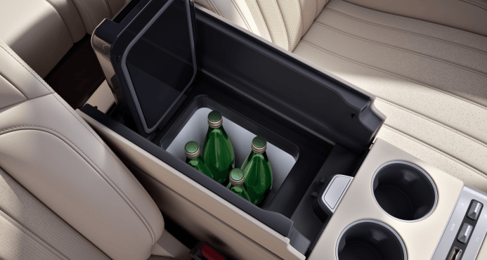 車內有43處收納空間,后備箱帶74L下沉空間,常規容積約658L,最大可拓展至1708L。五座版配備20L下沉式智能冰柜,支持-10~10°C調節;扶手箱內有6.4L智能冷暖冰箱位,支持-6~50°C調節。