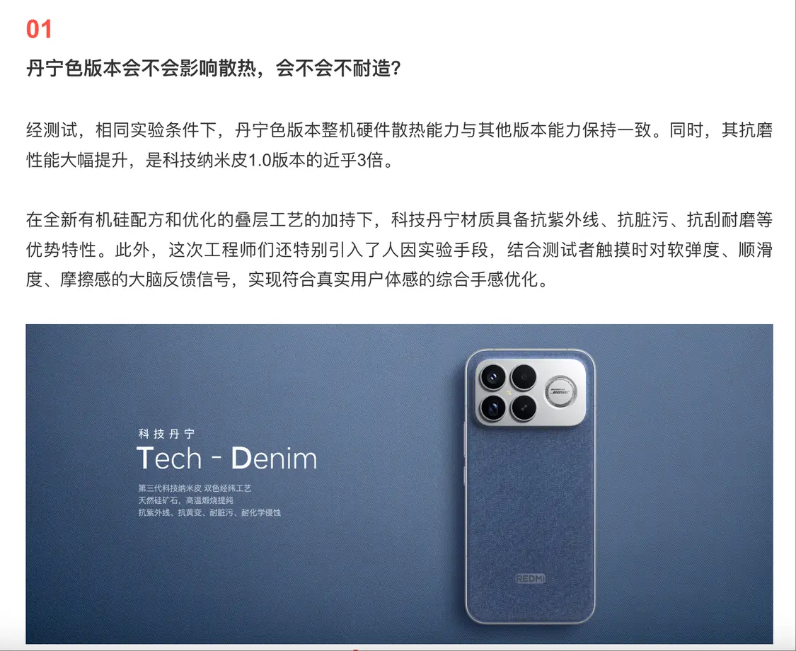 10月30日,REDMI K90系列答網友問(第二期)發布。針對丹寧色版本會不會影響散熱?答問中提到,經測試,相同實驗條件下,丹寧色版本整機硬件散熱能力與其他版本能力保持一致。同時,其抗磨性能大幅提升,是科技納米皮1.0版本的近乎3倍。