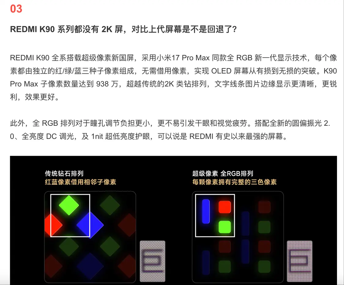 針對REDMI K90系列都沒有2K屏,對比上代屏幕是不是回退?官方介紹,REDMI K90全系搭載超級像素新國屏,采用小米17 Pro Max同款全RGB新一代顯示技術,每個像素都由獨立的紅/綠/藍三種子像素組成,無需借用像素,實現OLED屏幕從有損到無損的突破。K90 Pro Max子像素數量達到938萬,超越傳統的2K類鉆排列,文字線條圖片邊緣顯示更清晰,更銳利,效果更好。