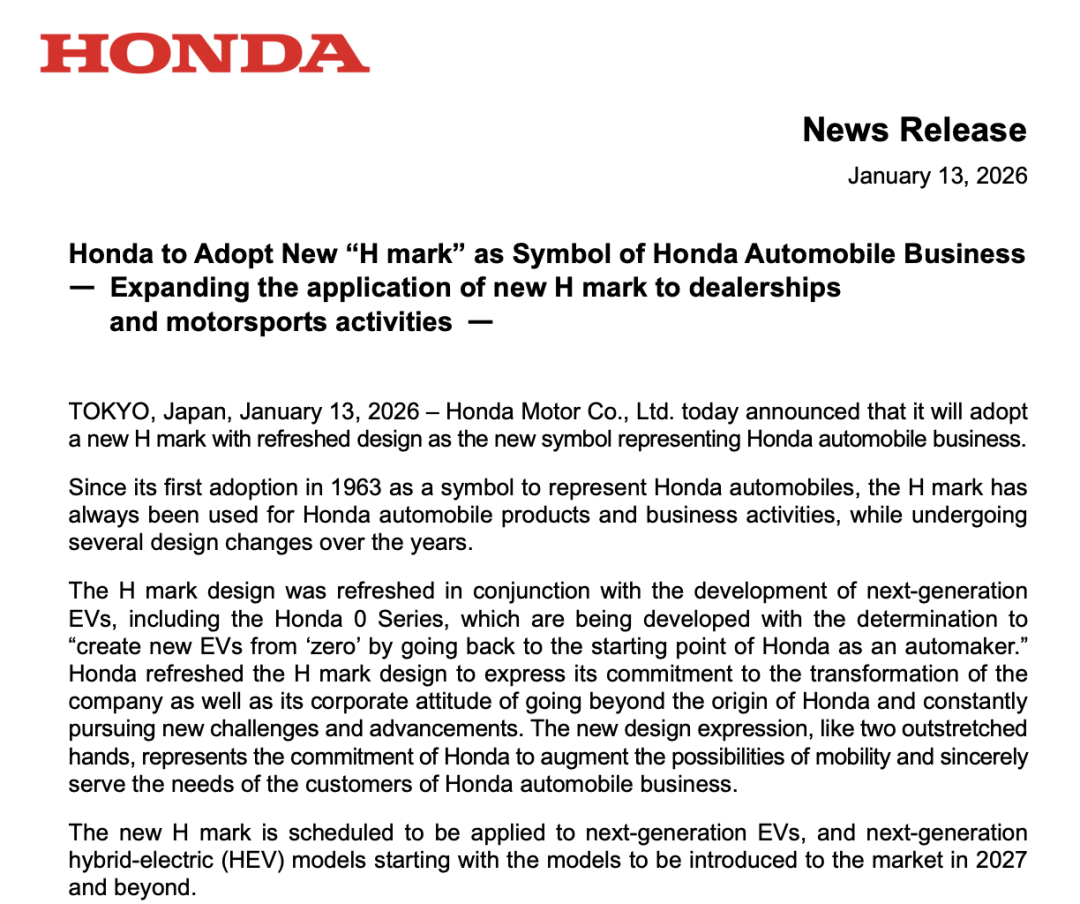 這一變化標志著本田自2001年以來,時隔26年首次對品牌標識進行重大更新。